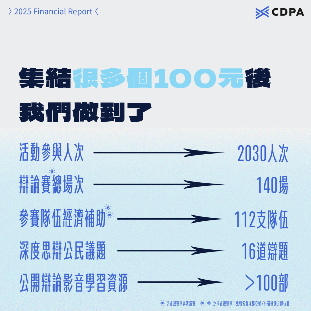 我們匯聚了各方的力量,將這些資源投注在 #打造青年競技舞台、 #提升辯論專業能見度、 #促進學生辯論社群再成長、 #維持協會運作。